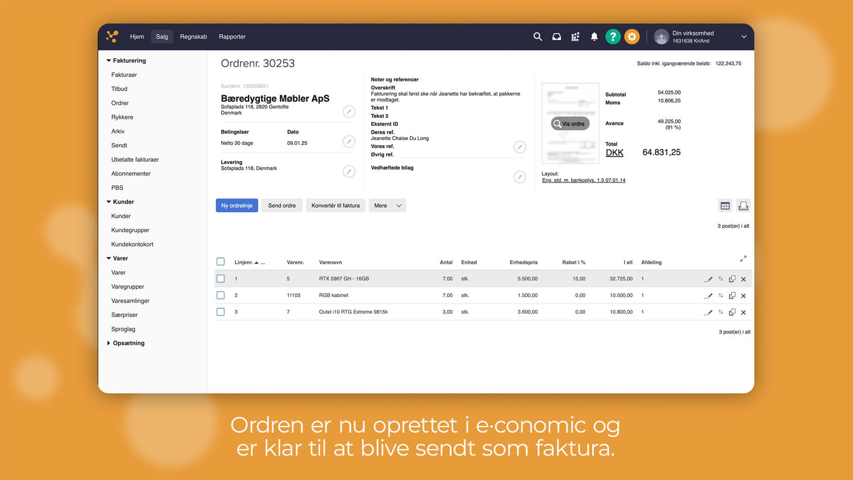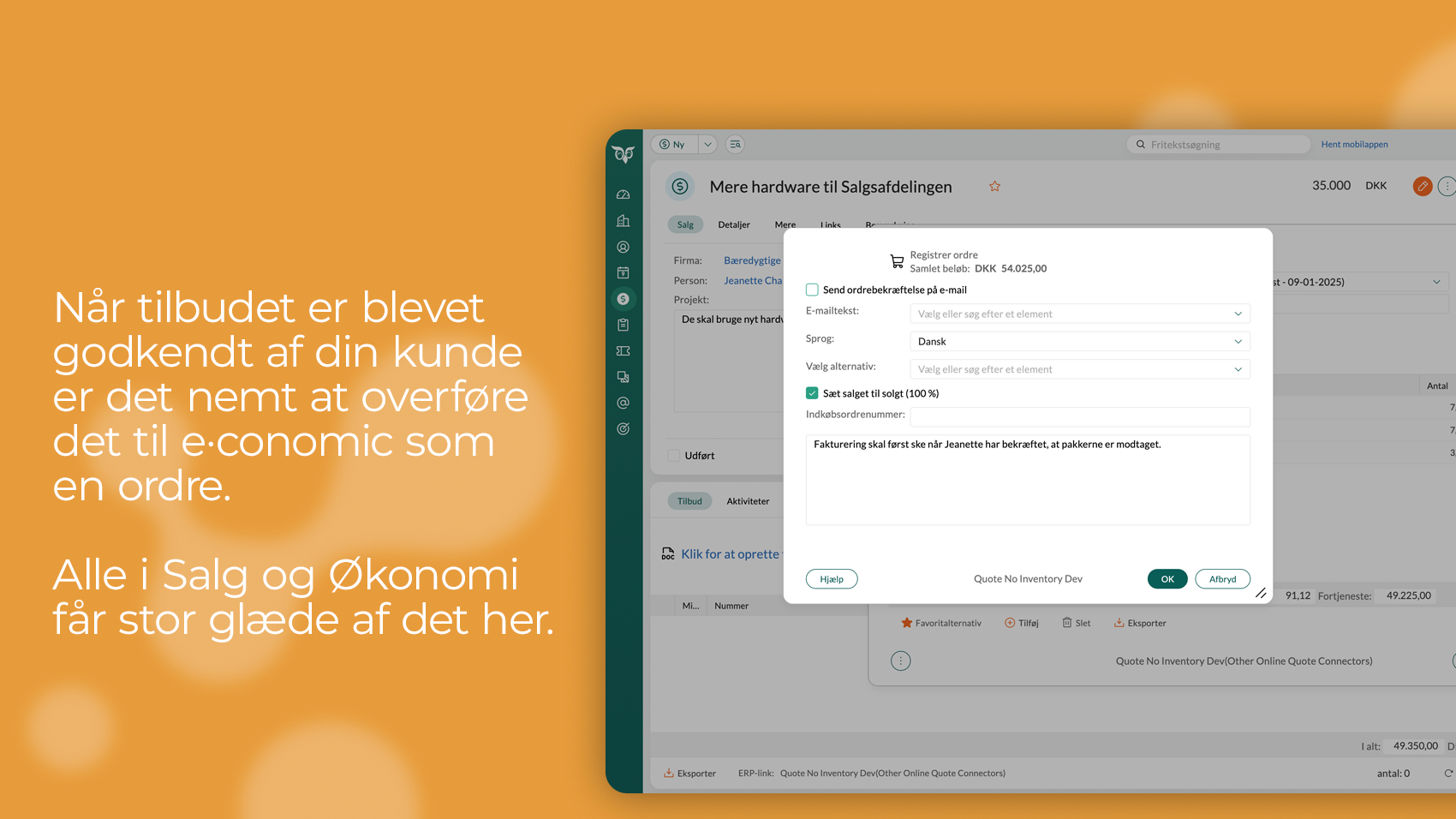 - Når et tilbud i SuperOffice accepteres, klikkes det nemt over i e-conomic som en ordre/faktura