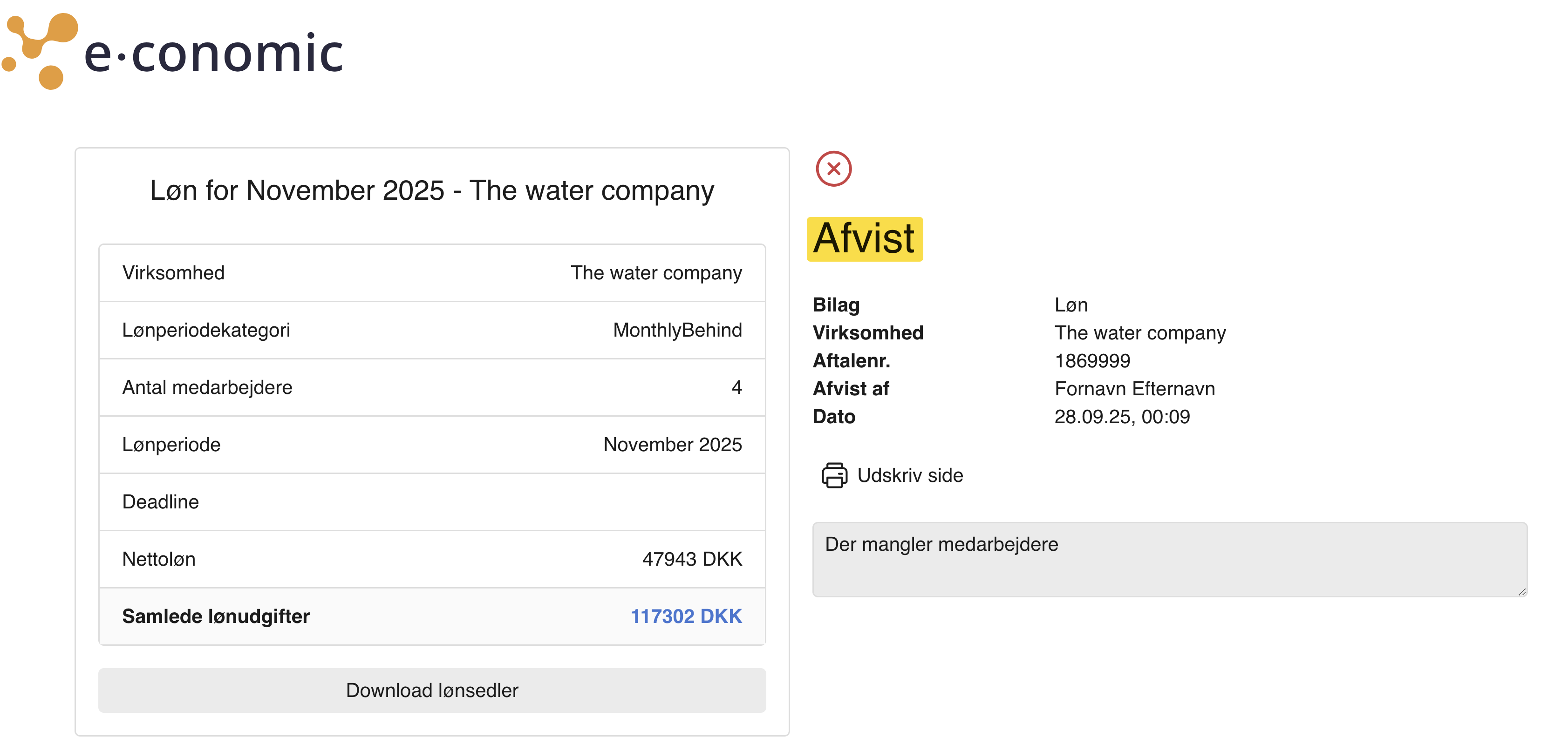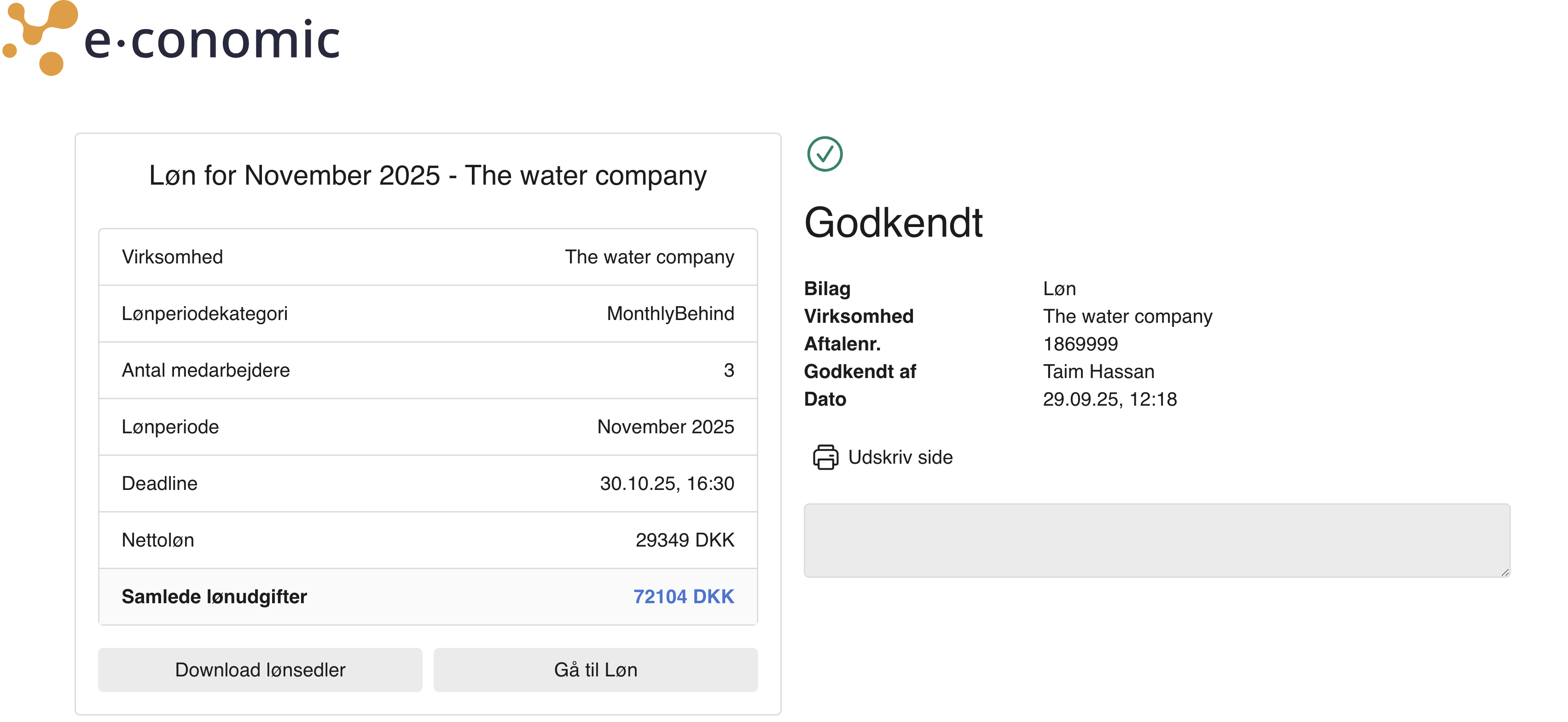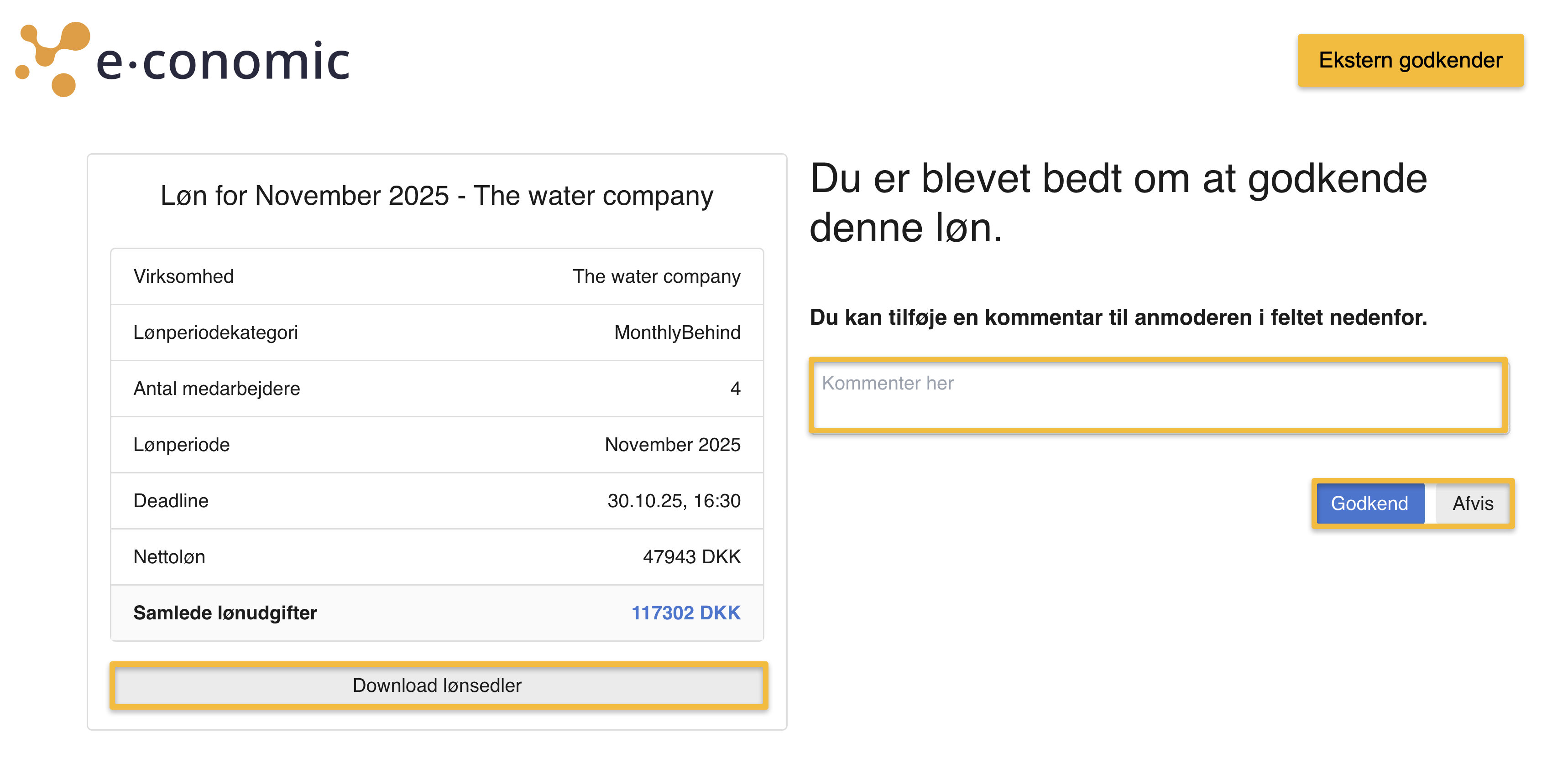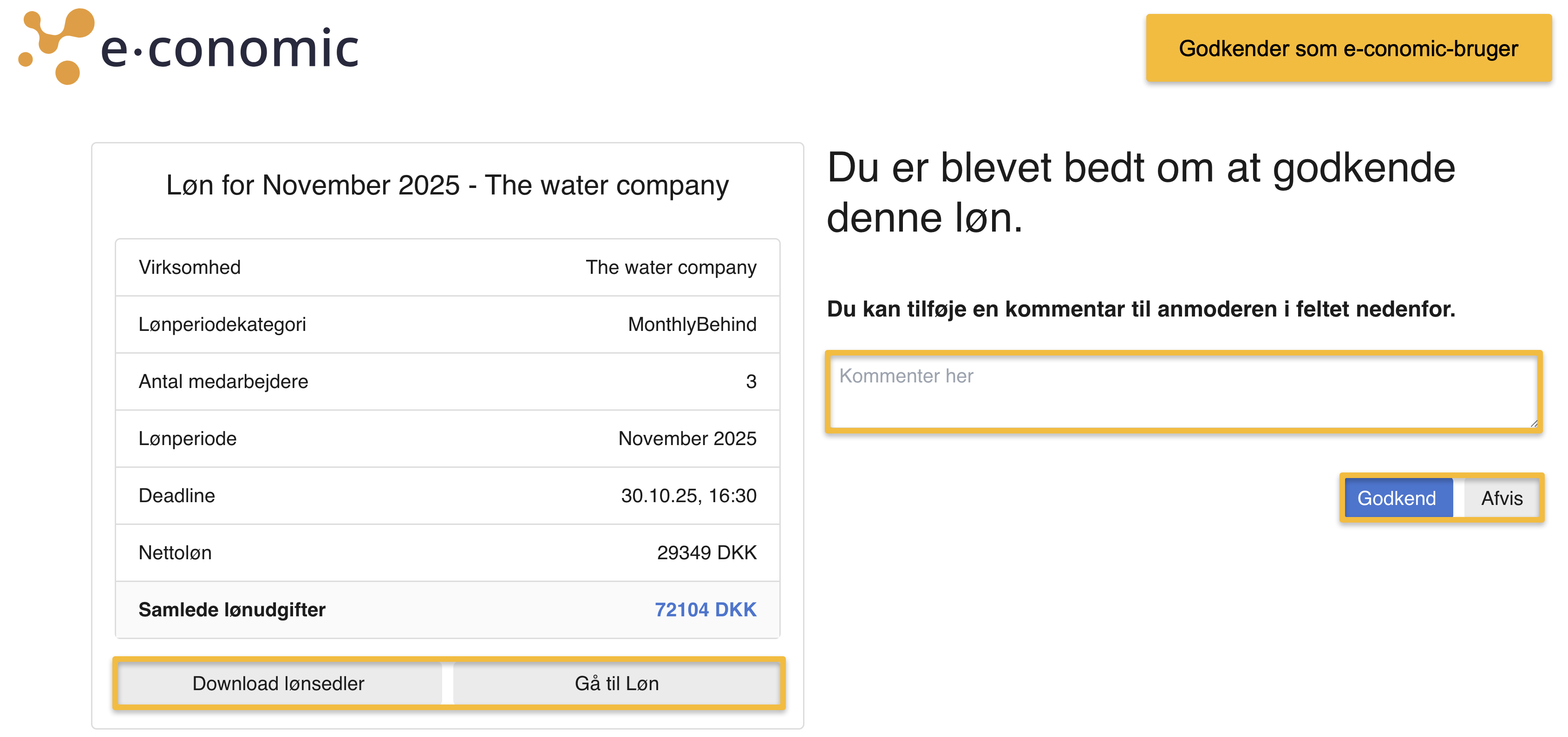 - Herfra kan du trykke på "Godkend" eller "Afvis". Din godkendelse registreres nu i e-conomic, og din revisor eller bogholder kan nu viderebehandle lønnen.