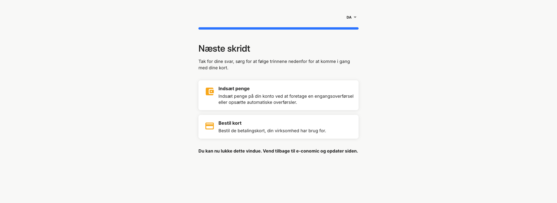 - Nu er Firmakort aktiveret, men for at gennemføre opsætningen skal du trykke på "Forsæt til Mynt".