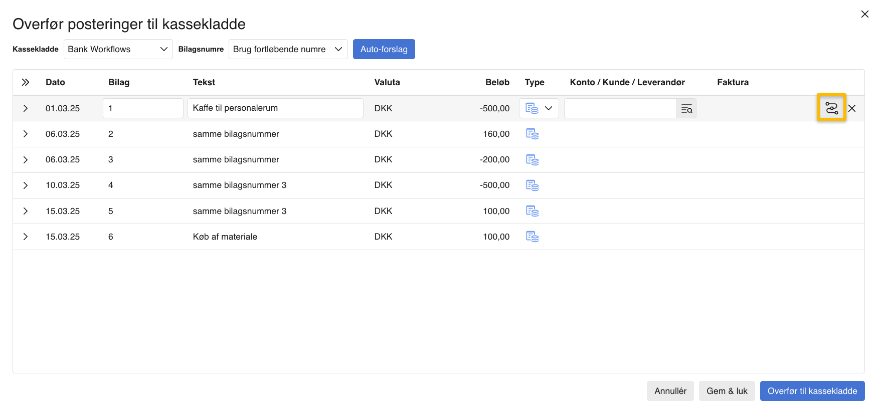 Denne funktion kræver, at du allerede har importeret dit kontoudtog med bankposteringer til bankafstemningen, eller at du får dem overført automatisk gennem en bankintegration. Hvis du endnu ikke har oprettet kontoudtoget som posteringer i din kassekladde kan du hurtigt få dem oprettet ved at overføre de importorterede bankposter til din kassekladde. Det giver dig tre resultater som du ellers ville skulle håndtere manuelt.