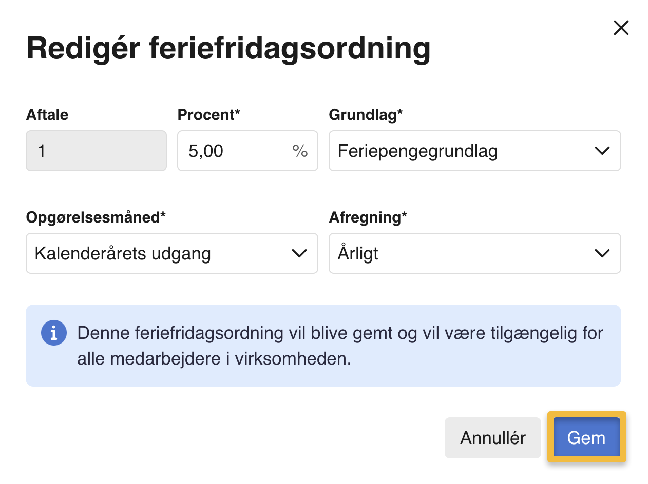 - I feltet "Procent" skal du angive hvilken procentsats der skal indbetales til ferie.