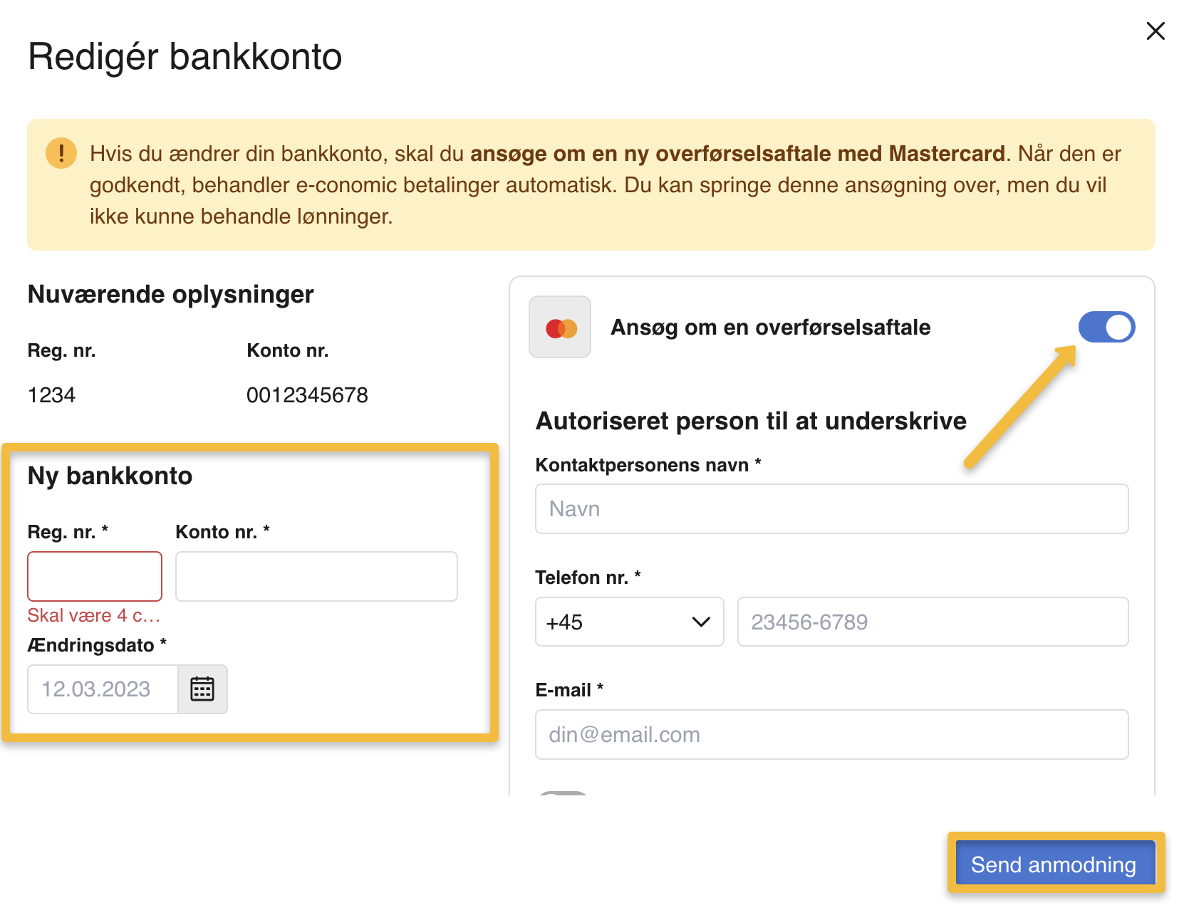 - Her kan du opdatere kontaktperson og ændre bankkonto. For at ændre bankkonto skal du trykke på "Anmod om at redigere". Her kan du både opdatere bankinformationerne og lave en ny ansøgning til Mastercard.