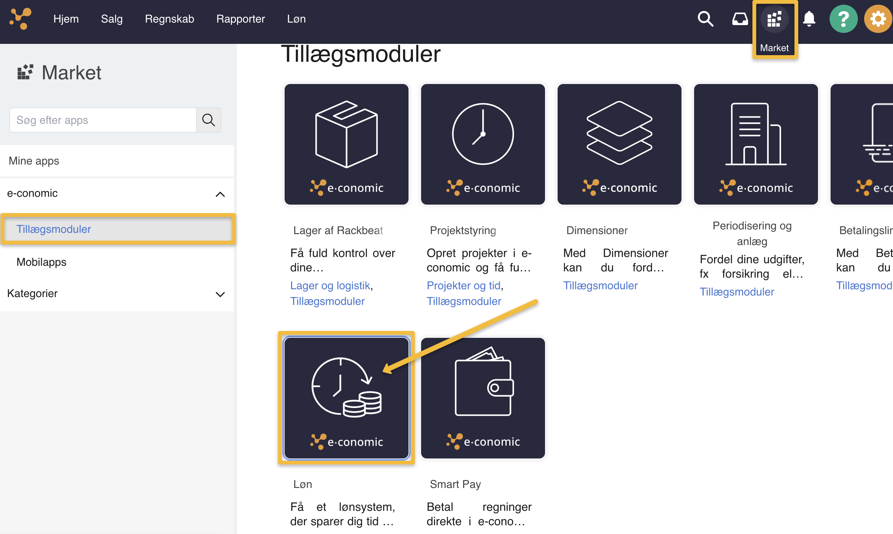 - Administrér den pågældende aftale og gå til "Market". Tryk her på "e-conomic" og derefter "tillægsmoduler".
