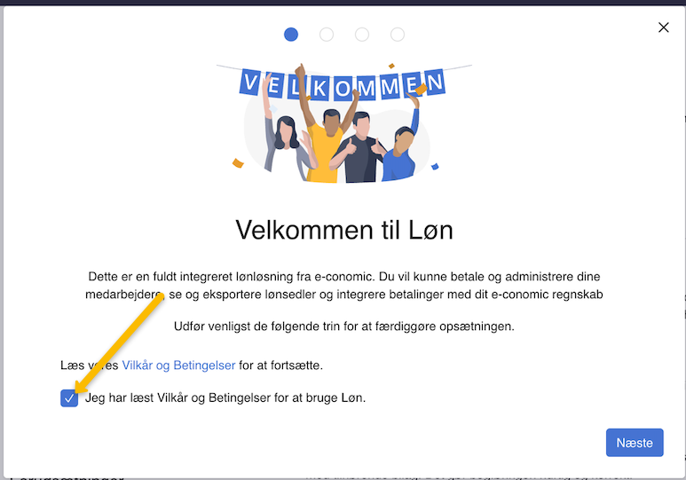 - For at komme igang med at håndtere løn i e-conomic skal du igennem en opsætning af fire trin. Denne starter når du har tilføjet modulet i Market.