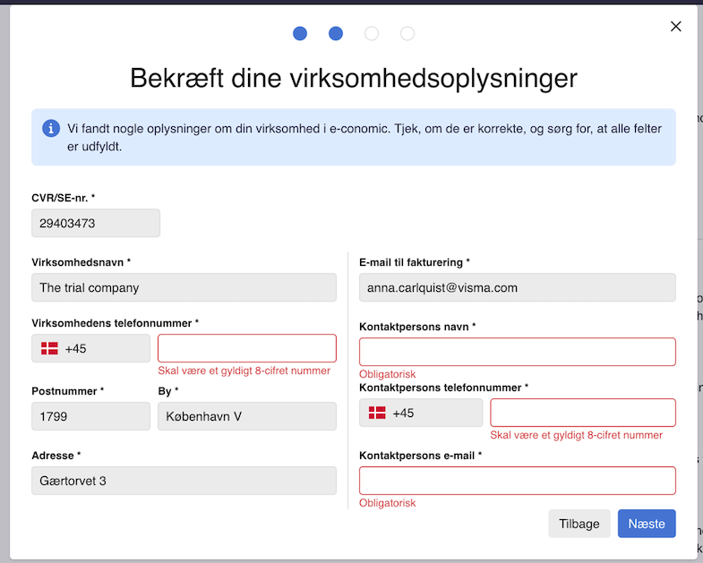 - Trin 3: Bemærk at du også skal udfylde navn, telefon og email på en kontaktperson. Dette skal være den person der har ret til at underskrive og agere på kontoens vegne og det kan derfor være din kunde.