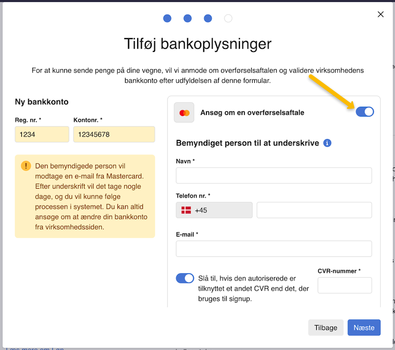 - Trin 3: Hvis du bentytter et SE nummer i stedet for et CVR nummer i denne opsætning, kan ansøgningen til Mastercard ikke ske automatisk.