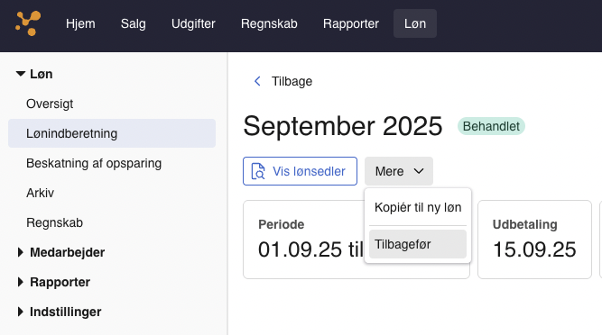 Når tilbageførslen er behandlet kan du lave en ny kørsel for samme periode, med de nødvendige opdateringer, hvis du stadig skal køre løn for perioden.