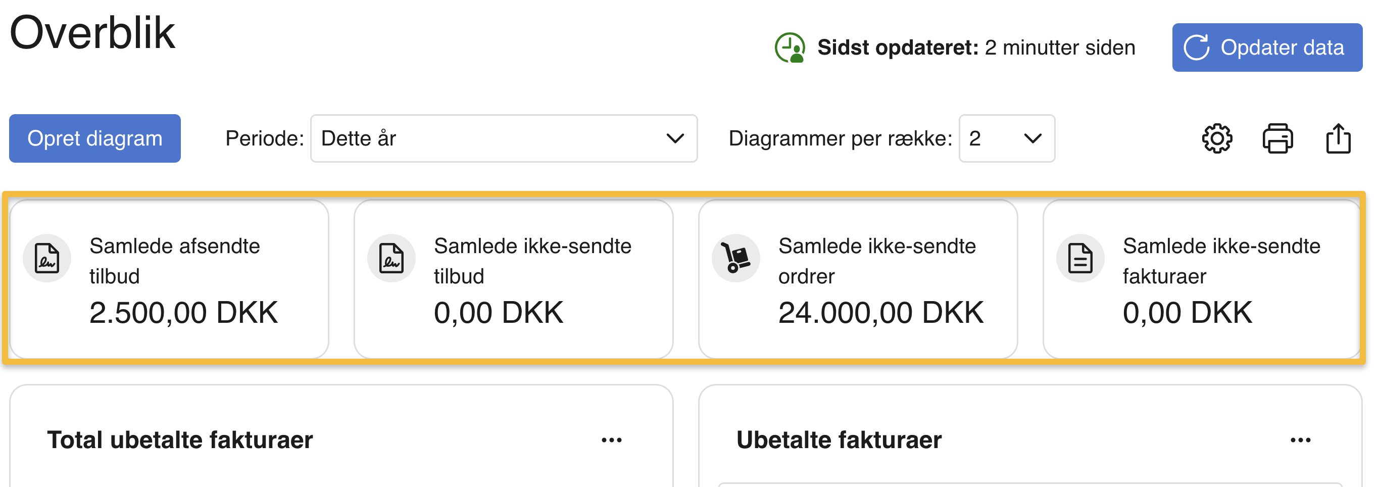 Siden kan tilpasses til dine behov, og vil altid vise de diagrammer du har valgt som nødvendige for forståelsen af din omsætning.