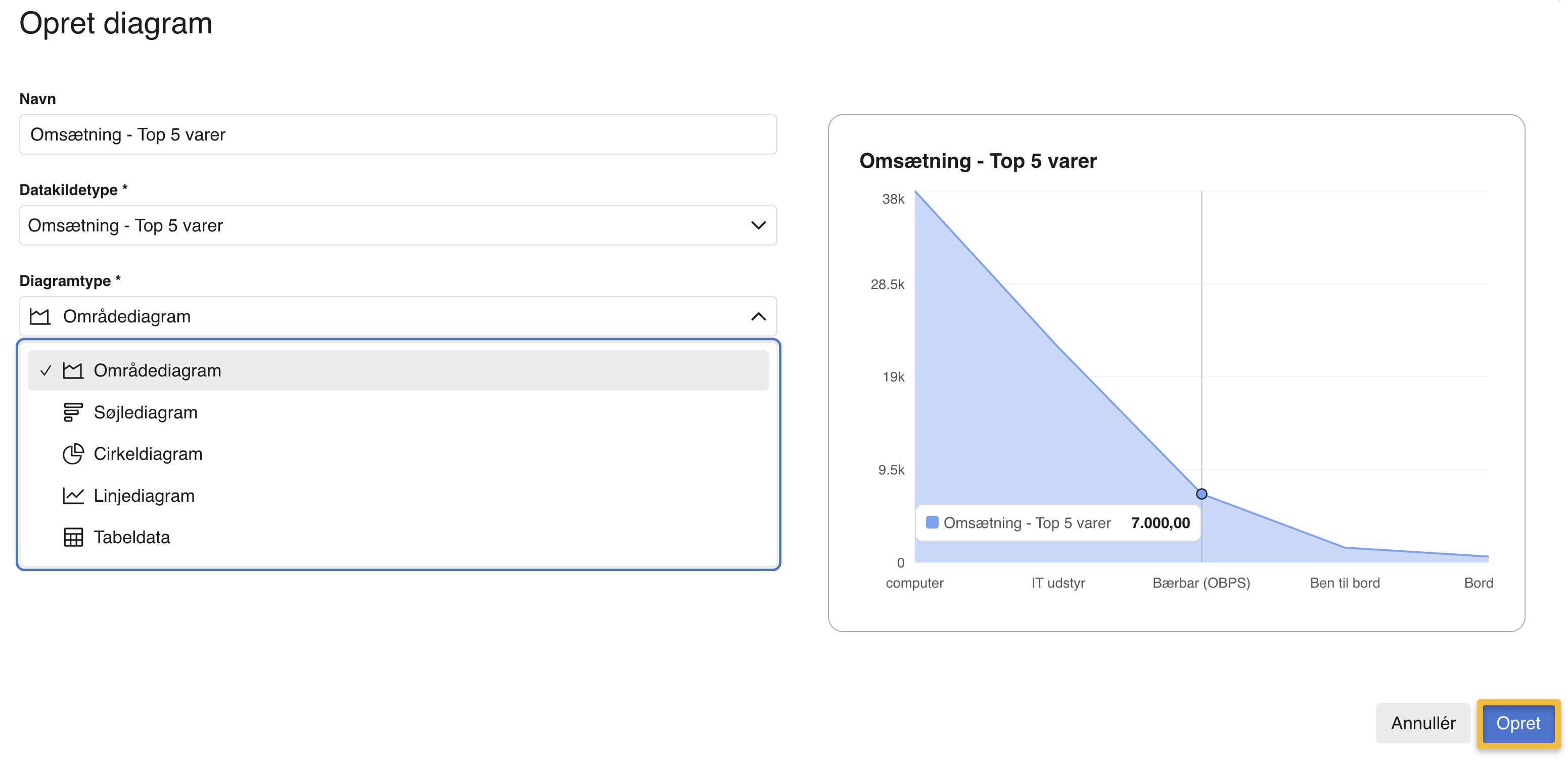 Du bygger din egen oversigt ved at vælge blandt forskellige diagramtyper der kan vise diverse aspekter af omsætningen, hvilket kan være en stor hjælp til at forstå din virksomheds økonomiske status og performance.