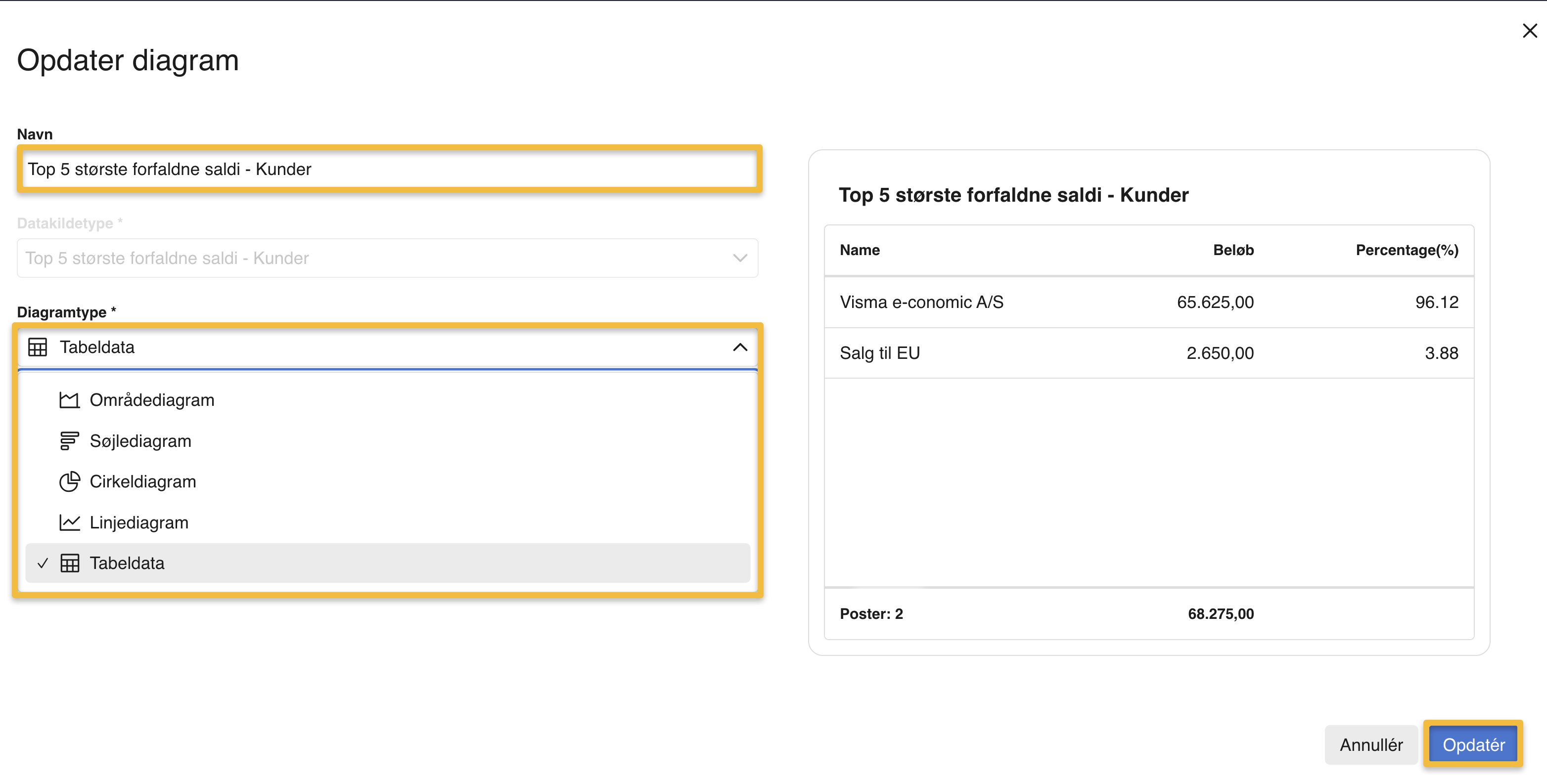 - I vinduet der åbner kan du så ændre diagramnavn og diagramtype. Tryk på "Opdatér" for at gemme ændringerne.